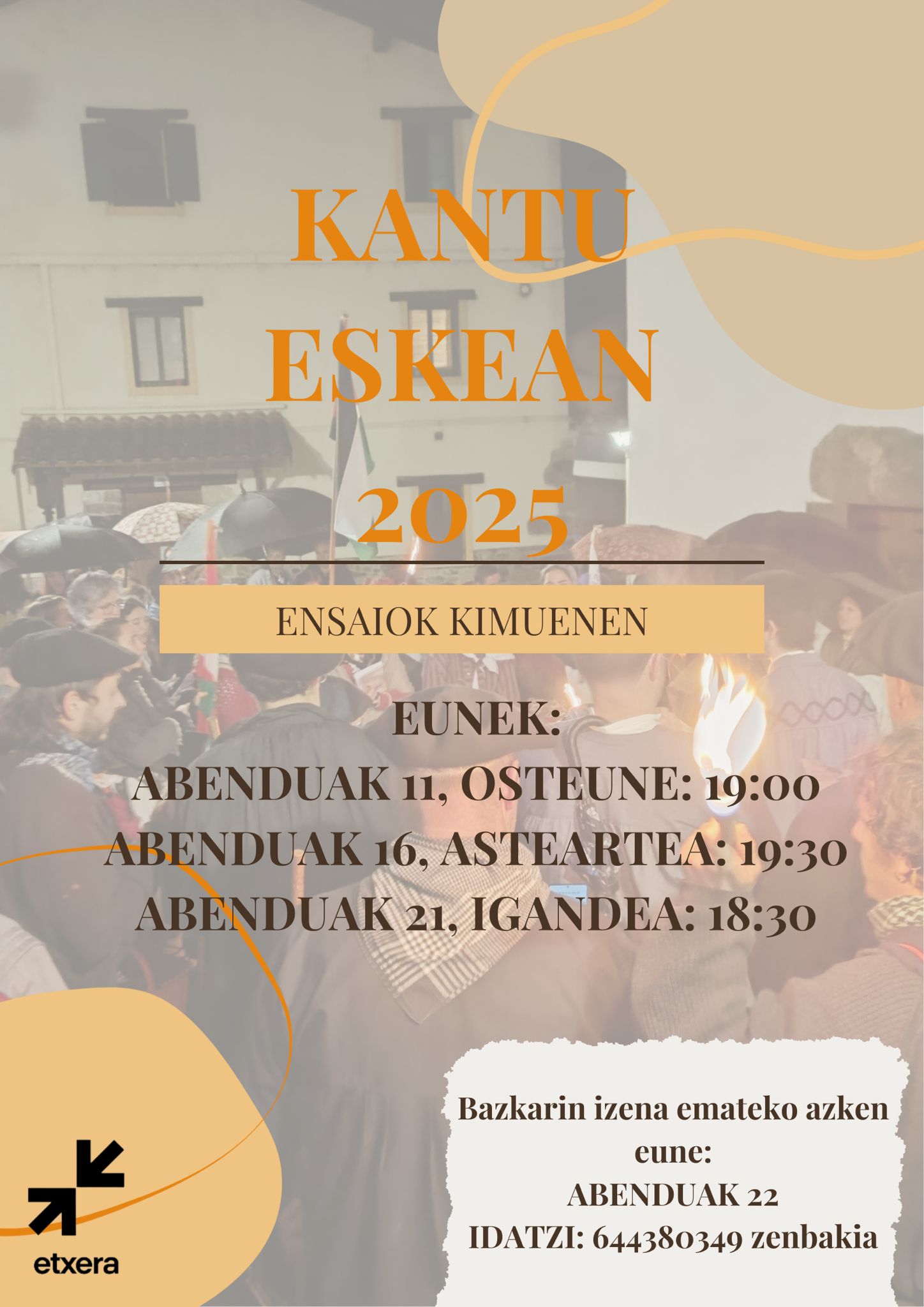 - 08:00etan Zubi-buru elkartetik abiatuta KANTU ESKEA baserriz baserri. Eguerdian bazkaria egingo dute elkartean. Arratsaldean, berriz ere kantu eskean jardungo dira herriko auzo eta baserrietan, eta iluntzean herrigunean.