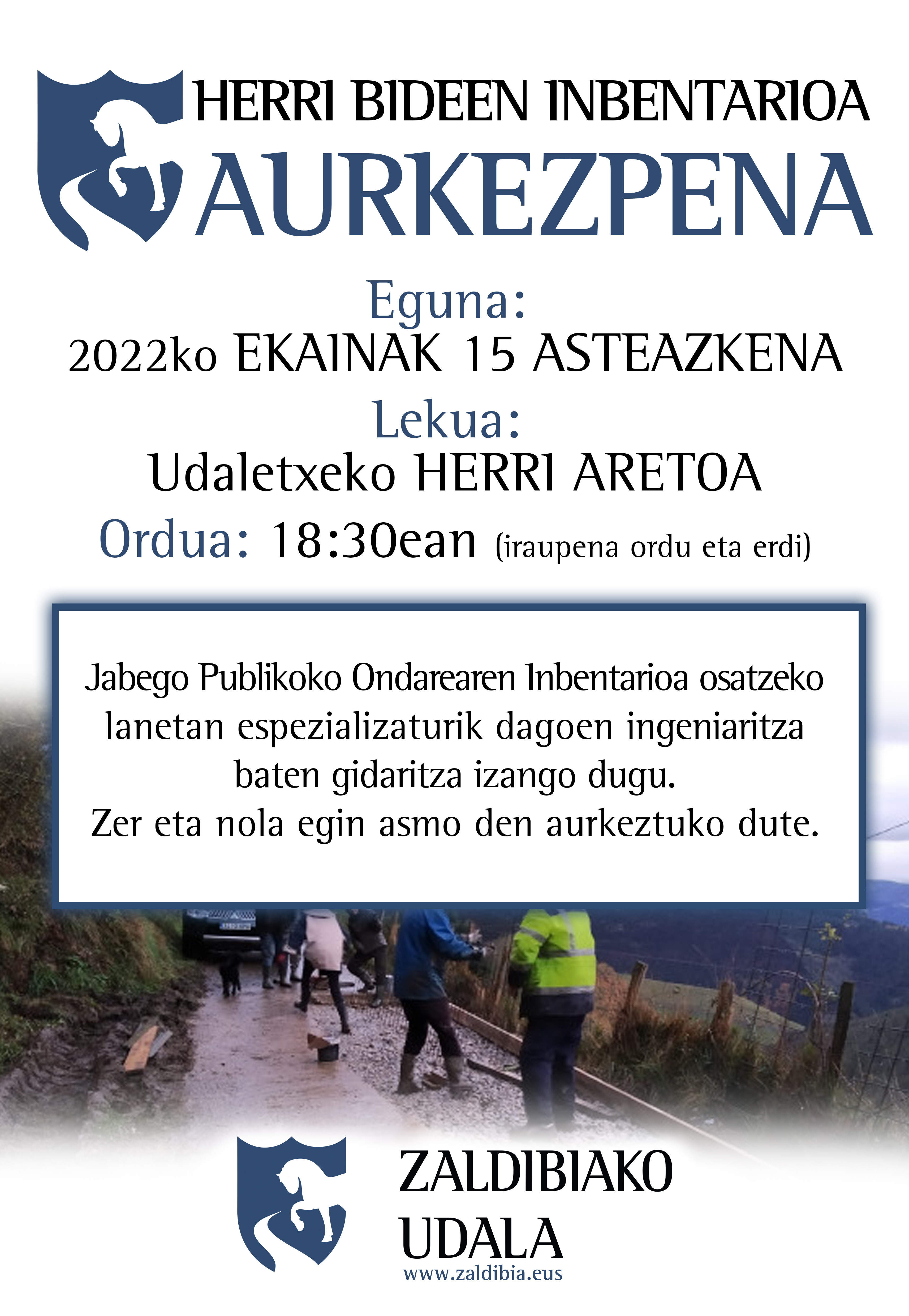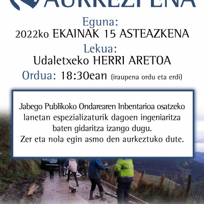Ingurumen, Lehen Sektore eta Landa Garapen udal lan-arloko bileretan landu ondoren, 2022rako helburutzat hartu zen herriko bideen inbentarioa egiteko prozesua egitea. Lanak hasi aurretik, azalpen eta aurkezpenerako batzarra antolatu da, EKAINAREN 15ean, ASTEAZKENA, iluntzean Udaletxean.